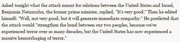 @LaureGonlezamar Netanyahou est fini à la pisse c'est pas nouveau. Voilà ce qu'il disait qq heures après le 11/09 (il était très en forme cette année là). C'est très bon", cela "va renforcer le lien entre nos deux peuples" suite à cette "hémorragie massive de terreur"🤮. https://web.archive.org/web/20090427212916/https://www.nytimes.com/2001/09/12/us/day-terror-israelis-spilled-blood-seen-bond-that-draws-2-nations-closer.html