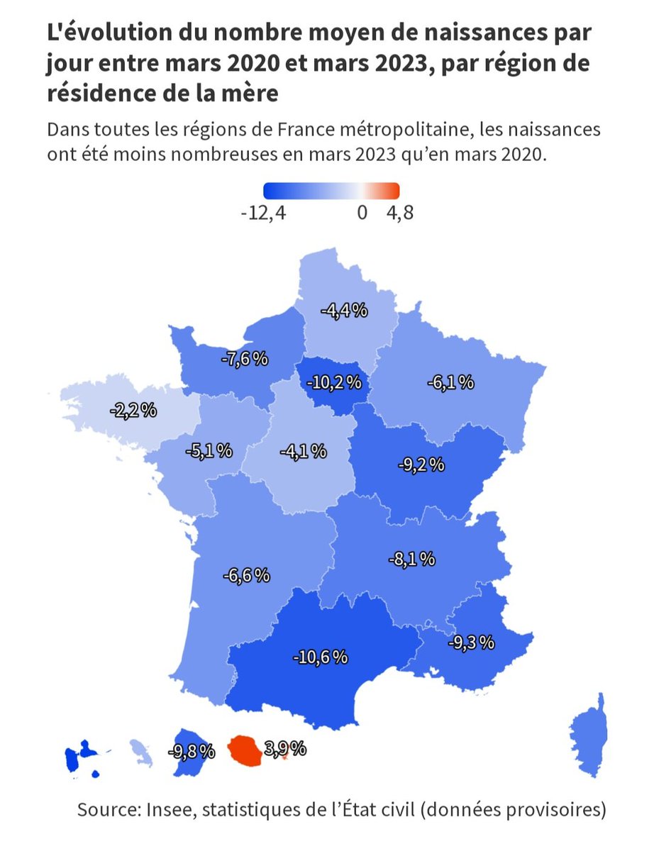 Bonjour à tous ! 👋 Voici la carte de France des baisses des naissances entre mars 2020 et mars 2023. Données INSEE. La cata partout, en particulier en Occitanie, Île de France, PACA et Bourgogne Franche-Comté. Pourquoi ? Thread. ⤵️