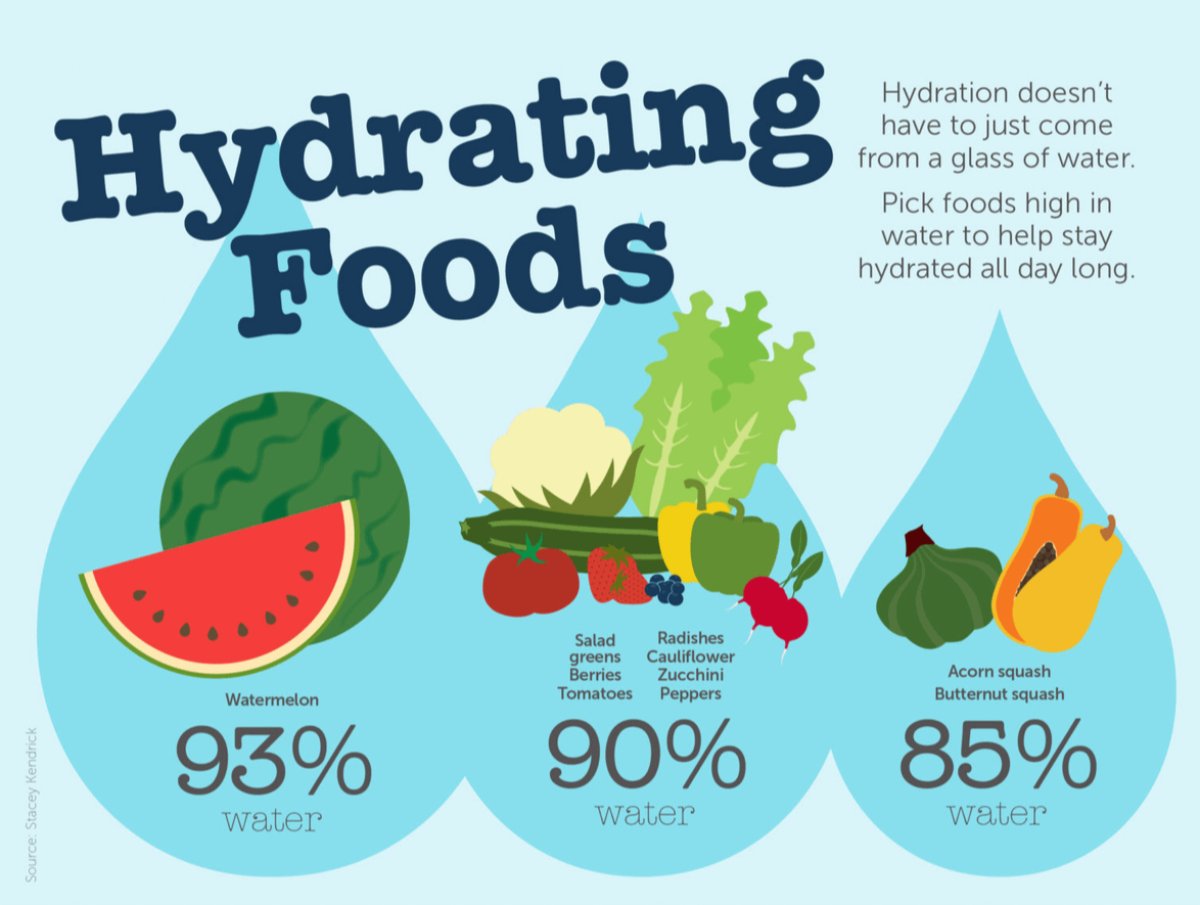 7. Eat hydrating foods Watermelon, cucumbers, celery have 90%+ water. They deliver fluid and essential nutrients. Eating your water keeps you hydrated and nourished.