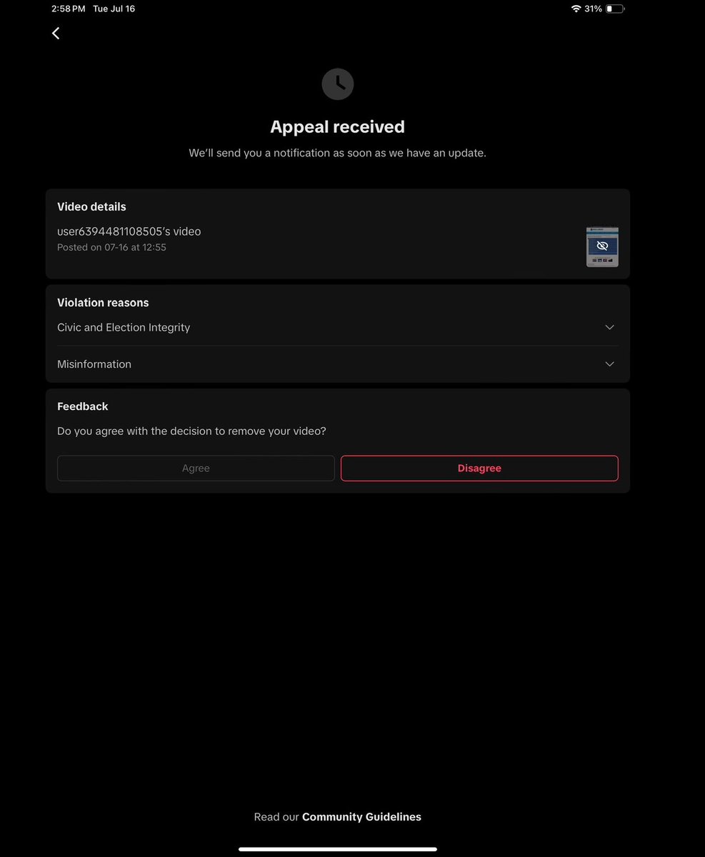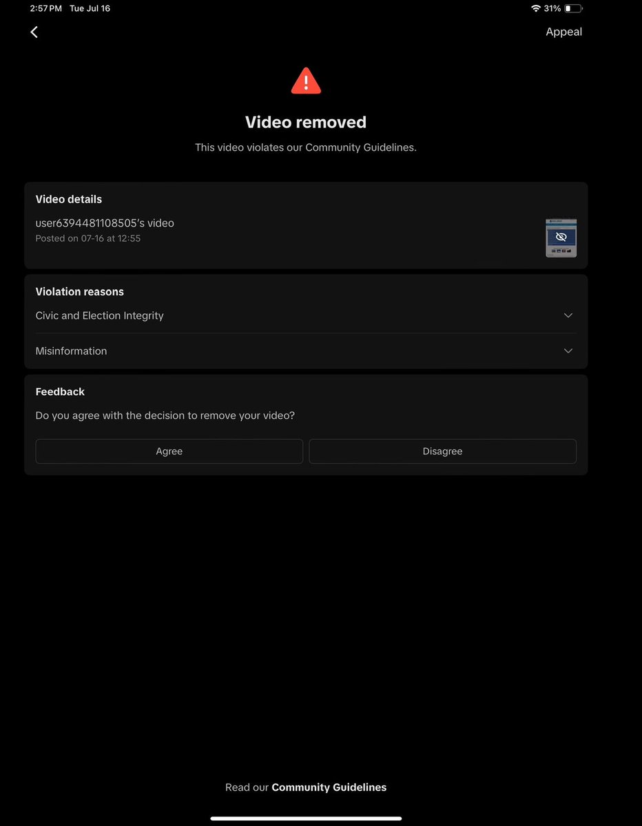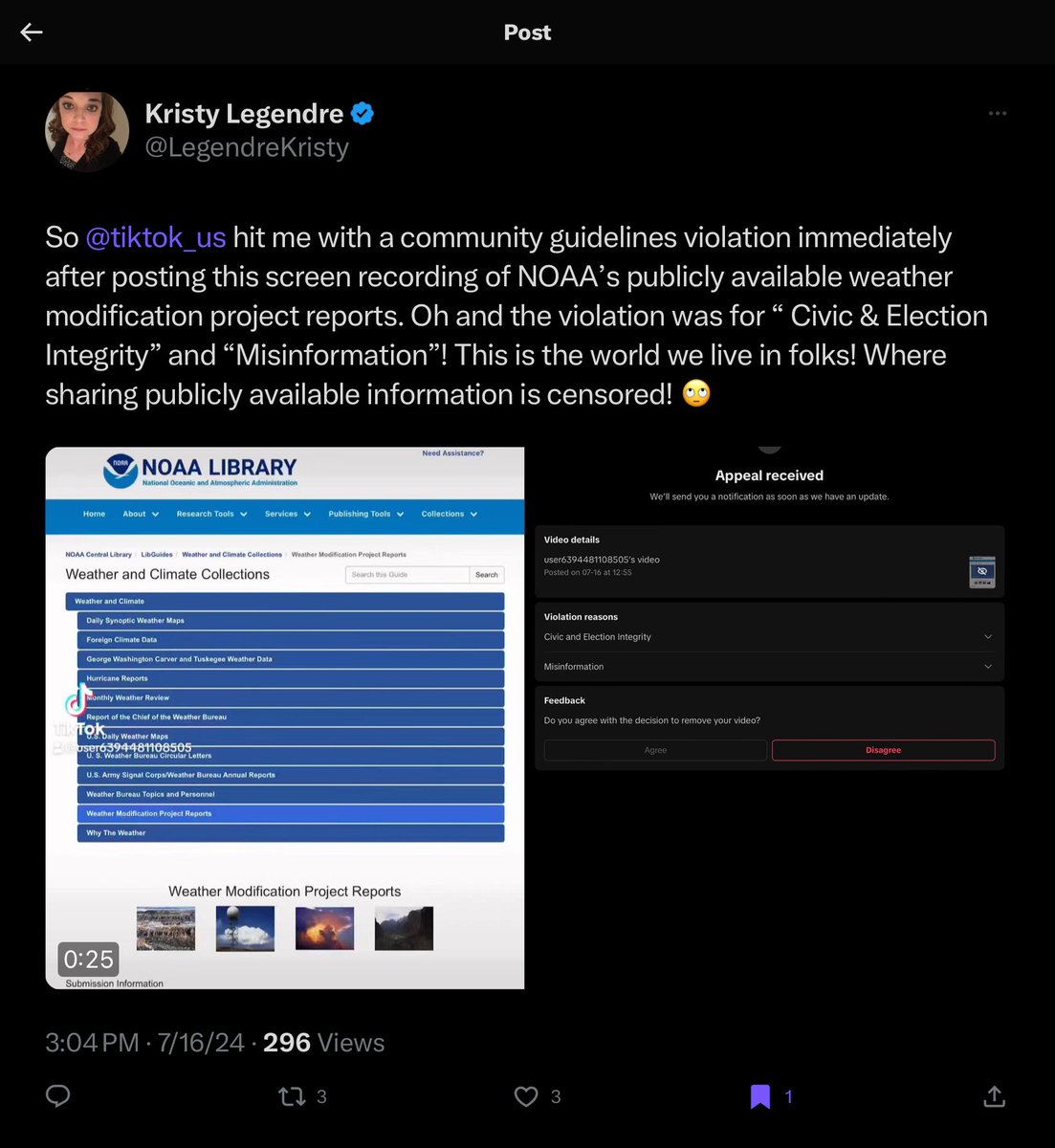 Why would @tiktok_us immediately have taken down my video and given me a community guidelines violation for making a video that did nothing more than share publicly available information from @NOAA website? And why was the violation for “civic and election integrity”? https://t.co/zA1nY06FK9