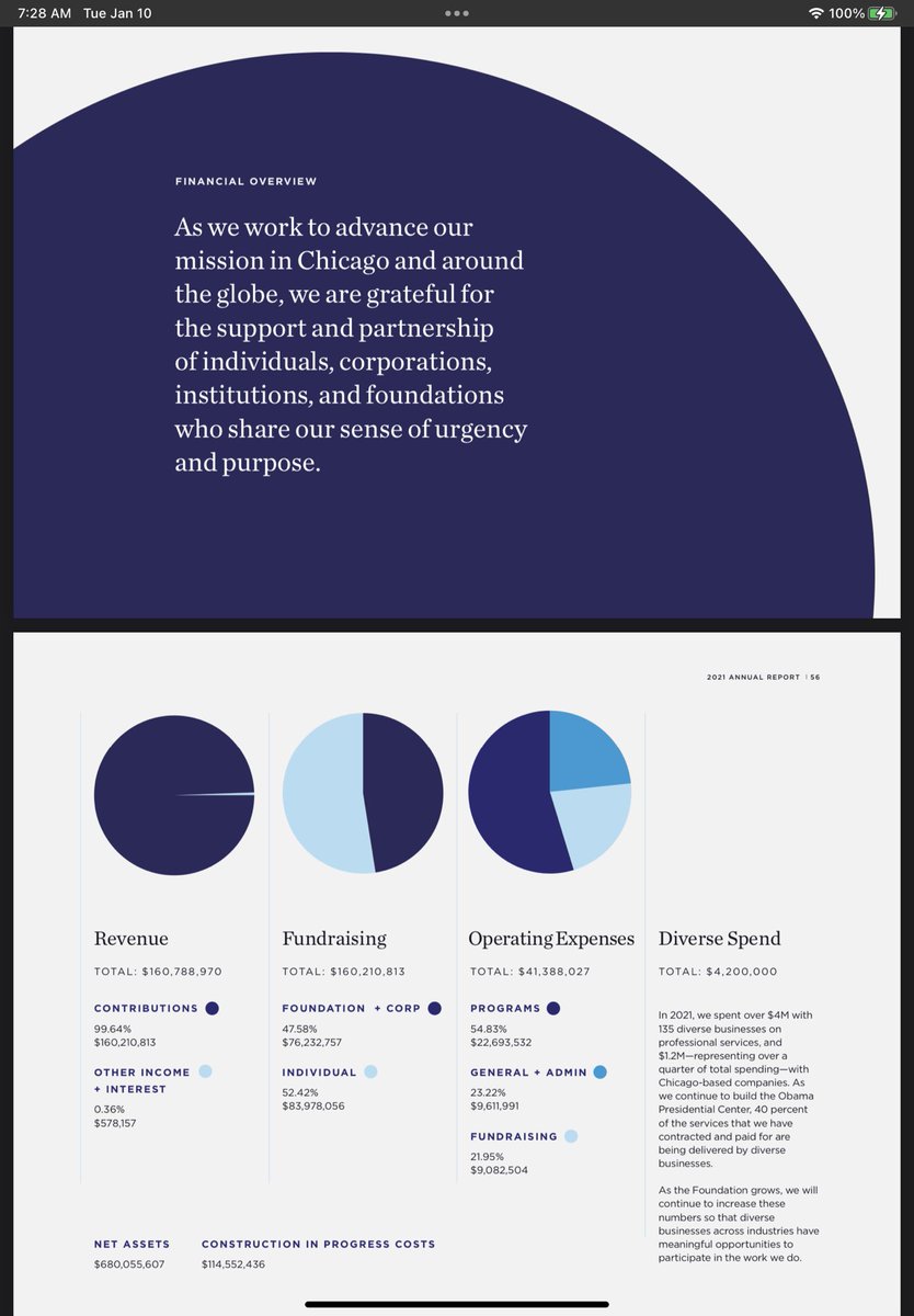 Link to the 2021 Annual Report for the @ObamaFoundation! I even took a screenshot for you of the financials page just in case you don’t feel like reading the whole report. Did you know most all corporations and foundations put these out annually? https://obama.org/wp-content/uploads/2021-Obama-Foundation-Annual-Report-1.pdf