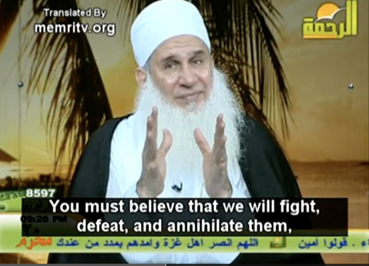 Flashback: Religious Muslim leader on Egyptian TV explains that the main cause of their conflict and wars against Israel is Islam, not a land dispute: ״If the Jews left Palestine to us, would we start loving them? Of course not. We will never love them. Absolutely not. The Jews are infidels – not because I say so, but because Allah said so [...] The Jews are the enemies of Muslims regardless of Palestine [...] This is it. We must believe that our fighting with the Jews is eternal [...] You must believe that we will fight, defeat, and annihilate them, until not a single Jew remains on the face of the Earth." If you ever wondered why there is no peace in the Middle East, this video will give you the answer. Religious leaders in the Arab-Muslim world use radical Islamic rhetoric to promote war and hatred against Israel and the Jewish people. This incitement must be stopped! Link to the video: https://www.memri.org/tv/egyptian-cleric-muhammad-hussein-ya%E2%80%99qoub-jews-are-enemies-muslims-regardless-occupation-palestine It seems that Twitter is limiting the reach of my posts, so please if you see this post, hit the like button, retweet and even share your thoughts in the comments below about the video. Every engagement will make it get more reach.