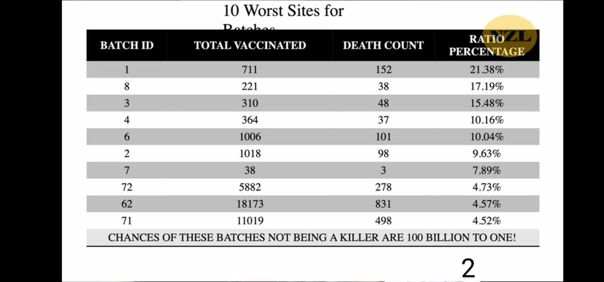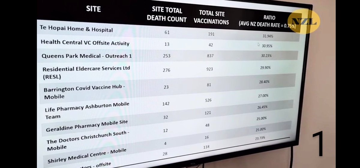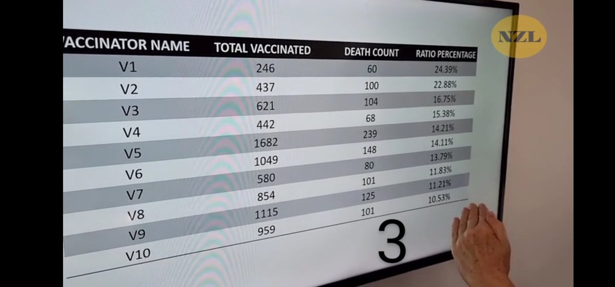 CETTE VIDÉO VA PASSER À L'HISTOIRE. Ce qu'elle révèle pourrait faire tomber tout le récit mensonger des injections anti-covid. Santé Nouvelle-Zélande (Te Whatu Ora) prétend se soucier de la santé des Néo-zélandais mais fait emprisonner Barry Young pour avoir révélé que certains sites de "vaccination" covid ont eu un taux de mortalité de plus de 30% et plusieurs autres entre 20 et 30% de leurs inoculés. Young est bien l'administrateur de la base de données gouvernementale N-Z d'où il a tiré ses tableaux, qu'il a anonymisés. Il a été arrêté peu de temps après l'interview ci-dessous de (@LizGunn18) Liz Gunn, non pas pour avoir menti mais seulement pour avoir révélé des données confidentielles et "répandu de la désinformation". Insistons sur le fait qu'aucun nom n'avait été révélé, ni vaccinateurs ni vaccinés, seulement les noms de lieux et les statistiques de mortalité. Comme telles, les infos partagées sont du domaine public et auraient pu être obtenues sur simple demande d'accès à l'information (FOAI), dans une démocratie fonctionnelle. Voici 2 liens pour l'entrevue Gunn-Young. Ce document vidéo est la mère de toutes les révélations covid (M.O.A.R.), pour reprendre expression de Gunn: Rumble https://rumble.com/v3ynskd-operation-m.o.a.r-mother-of-all-revelations.html Odysee (source alternative) https://odysee.com/@yabba:e/Liz-Gunn--The-Mother-Of-All--COVID-19-Vaccine--Revelations-%28Data-Revealed-In-This-Video%29:1?r=FLysXE9RWJ9FepFUVt7CnacdTw22TKH9 Sommairement, Les tableaux ci-dessous montrent l'hécatombe que certains lots ont causée sans que le public n'en ait été informé et sans qu'aucune précaution connue n'ait été prise pour la suite. Certains vaccinateurs ont, sans le savoir, envoyé à la mort plus d'une centaine de personnes confiantes qui ne demandaient qu'à être protégées. Tableau 1 Par site : Notez que la mortalité de tout le pays est de 0.75% (coin doit en haut du tableau 1) pour cette opération 'sanitaire', soit une personne décédée pour 133 injectés, ce qui est beaucoup plus que le 1 sur 100 000 dont on nous parlait. Des éclaircissements compétents seraient nécessaires sur ce point très sérieux. Remarquez les taux effarants de mortalité post injection dans la colonne de droite, souvent au-dessus de 30%. Tableau 2 Par lot (batch) : Les chiffres parlent d'eux-mêmes. 21% des injectés du lot #1 sont morts, soit plus d'une personne sur 5. Le lot #8 est bon deuxième avec 17%, presque 1 personne sur 6. Tableau 3 Par vaccinateur L'un des vaccinateurs a vu 24% de ses injectés décéder peu après. Un autre, 22,9%. Plusieurs ont plus d'une centaine de morts à leur actif, le pire étant 239 décès. IL FAUT 1-Qu'il y ait un moratoire sur les injections ARNm utilisées comme vaccins. 2-Que tous les pays dévoilent leurs données vraies sur ce sujet. Ils les ont, n'en doutez pas. 3-Que justice se fasse. Cet événement est un "game changer" si assez de gens en sont informés et prennent position. Nous le devons aux victimes. Si vous le pensez aussi, alors relayez svp. Et que toutes les personnes décédées reposent en paix. #Covid #LizGunn #BarryYoung #NZ #ARNm