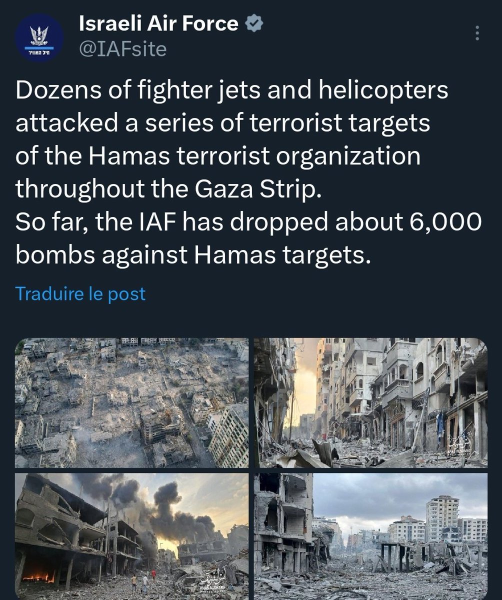 Israël rapporte fièrement avoir largué en quelques jours plus de 6000 bombes sur Gaza, qui n'a pas d'armée. Gaza c'est 2,2 millions de civils entassés dans un territoire de 50 km × 10 km. Un million d'enfants. Verrouillés, prisonniers d'Israël, nulle part où aller. Et ce n'est que le préambule, annonce l'aviation. L'attaque, la vraie, va commencer bientôt. (Photos fournies par l'aviation israélienne)
