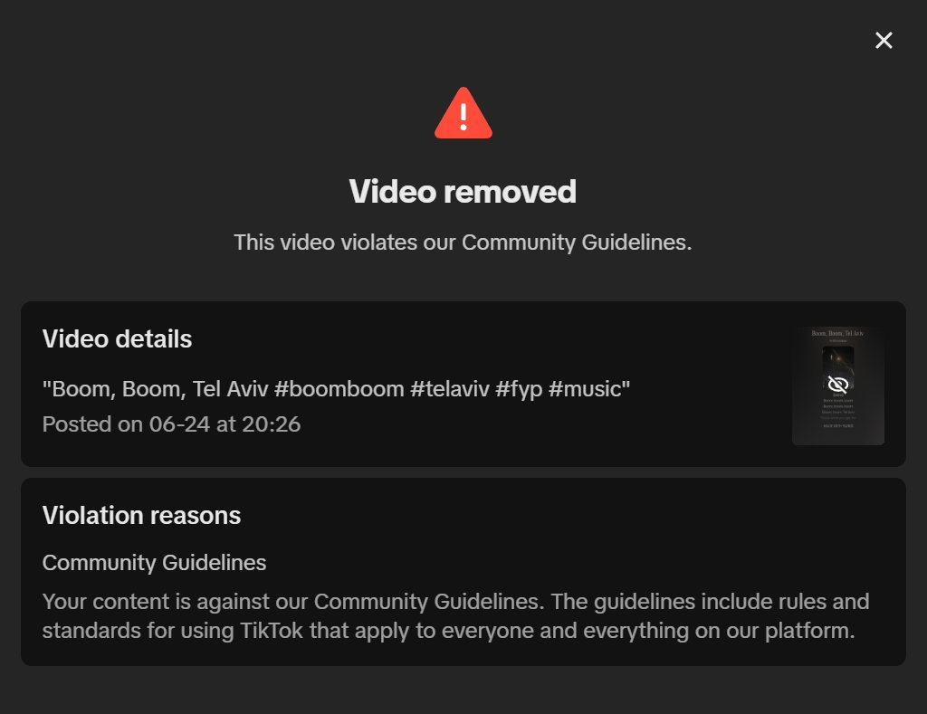 Boom, Boom, Tel Aviv in considered a violation on Tik Tok now https://t.co/4cZMbpkdcB