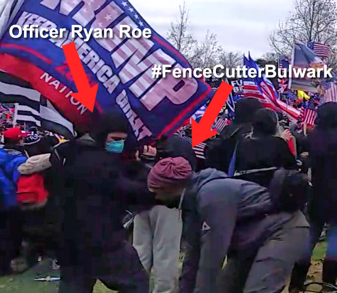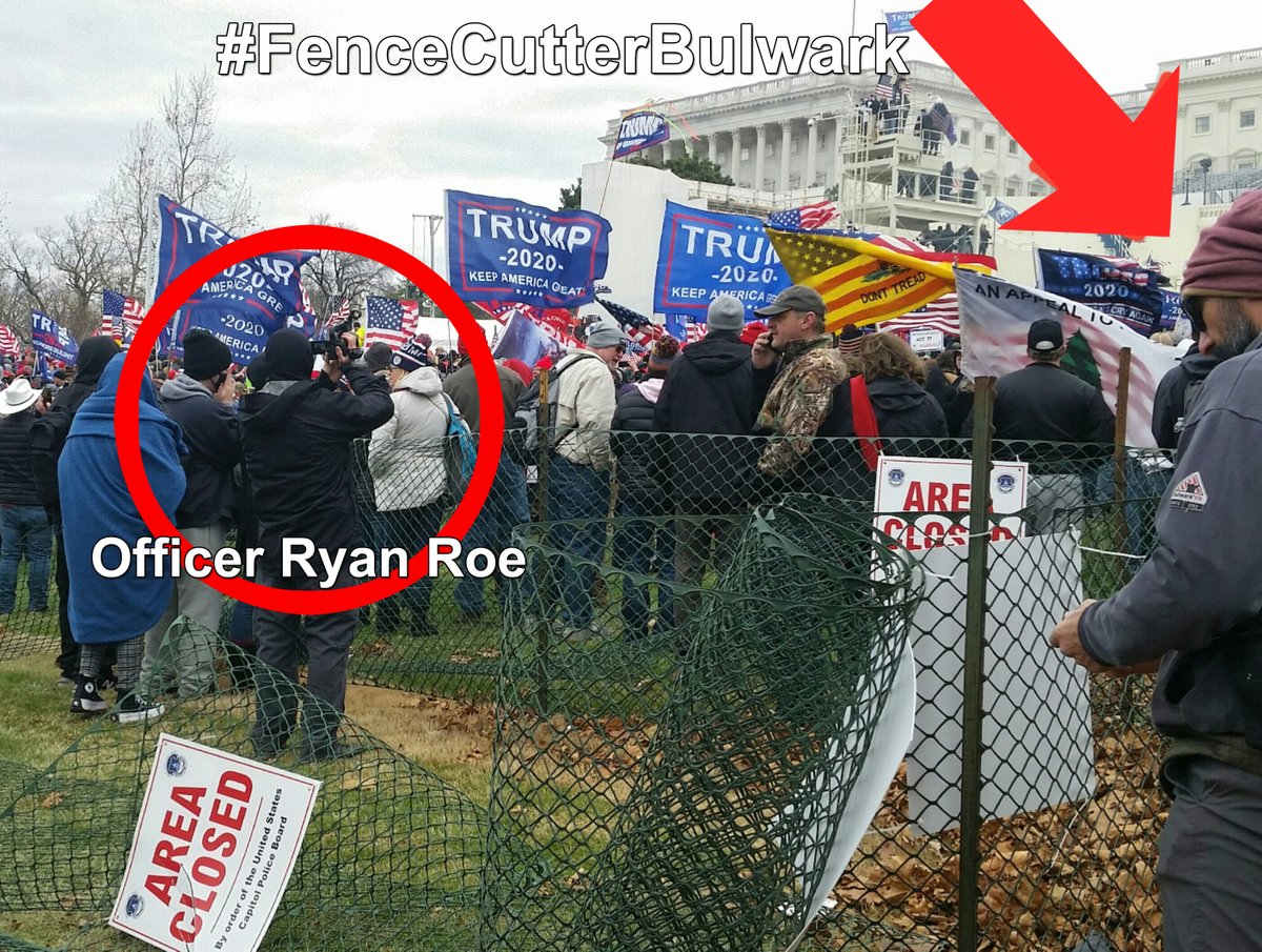 By synchronizing sealed footage from @Twinity5’s January 7, 2021 viral thread, I discovered that undercover officer Ryan Roe thanked #FenceCutterBulwark as he removed fencing. “Appreciate it brother,” said Roe, as Twinity5 captured this frame.