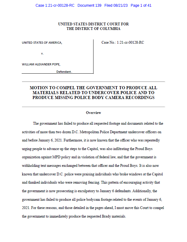 I have filed a motion to compel the government to produce all materials related to undercover police at the Capitol on January 6, and to produce missing police body camera recordings. This motion presents new evidence of illicit behavior by undercover police at the Capitol.