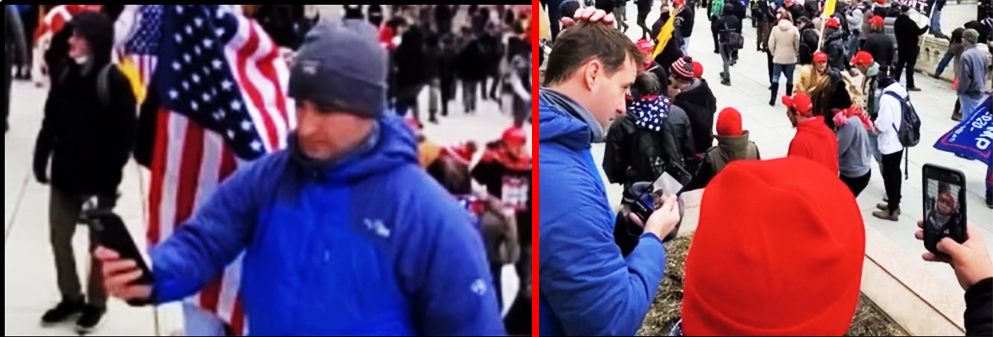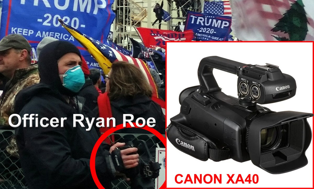 Undercover officer Ryan Roe noted that he was using a Canon XA40 to film on January 6. Thanks to a viral thread that shows a man holding the same model of camera, I have been able to identify Roe in the crowd.