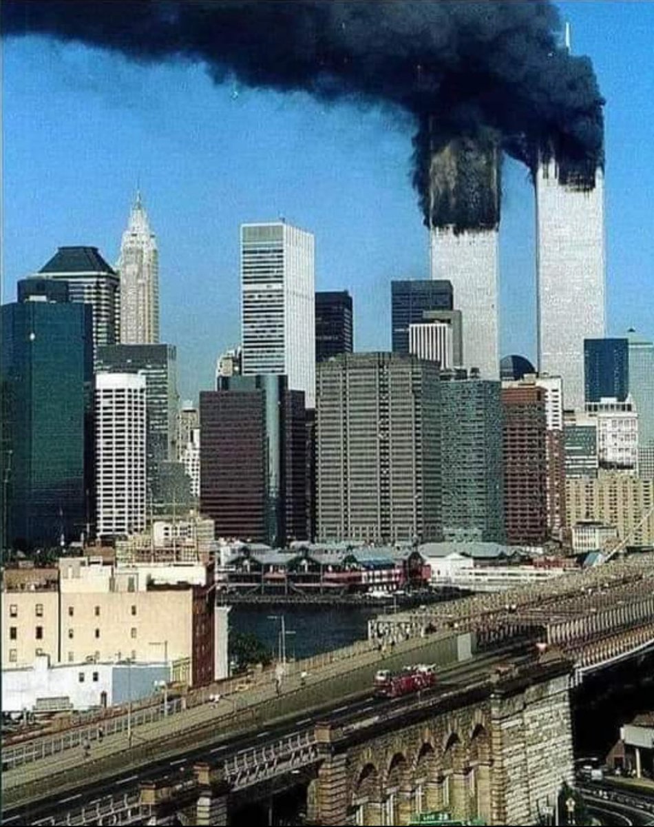 In the bottom of this photo, you can see Ladder 118 crossing over the Brooklyn Bridge on their way to the World Trade Center.This is the last known photo.Every single firefighter on that truck perished just a few minutes later.We vowed to never forget.Unfortunately, so many have.