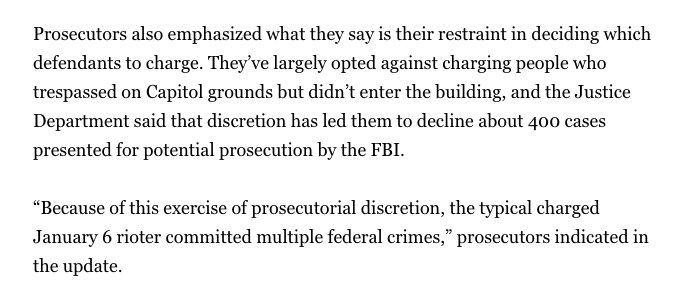 DOJ says they showed "restraint" by not charging 400 more Americans that FBI wanted them to go after -- for walking near but not in the Capitol. Just sick beyond belief how FBI was obsessed with this for years.