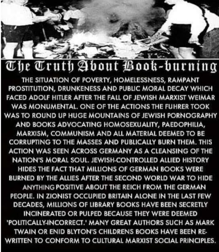 One of the actions the Führer took was to round up huge piles of j€wish pornography and books advocating homosexuality, paedophilia, marxism, communism and all material deemed to be corrupting the masses and publically burn 🔥 them. https://t.co/622EXk0RB0