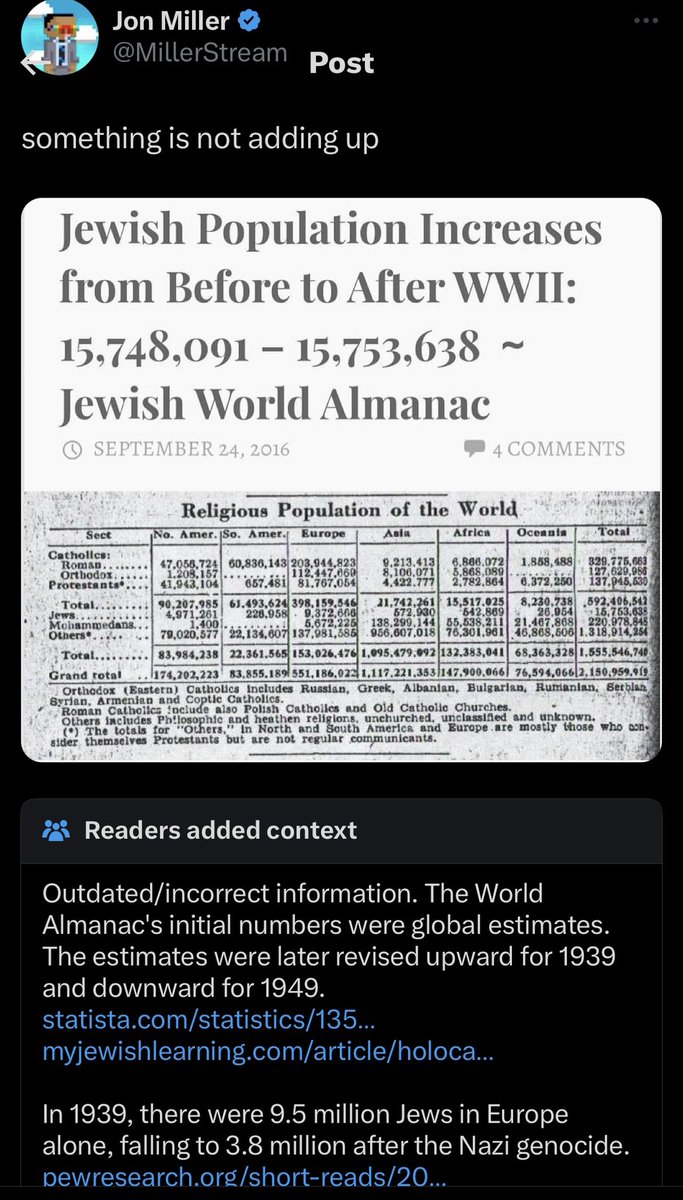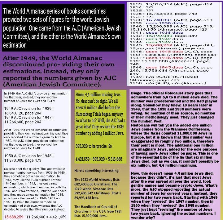 @Uncommonsince76 Jewish Pop. increased from before WW2 15,748,091 to 15,753,638 in 1948 ~ World Almanac. In 1949, the World Almanac discontinued providing their own estimations for the world's Jewish population. Instead, they only reported the numbers given by the AJC. https://t.co/kxsN1zZ2aS https://t.co/YEwGCbSHfF