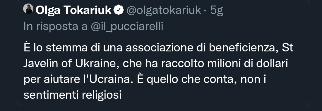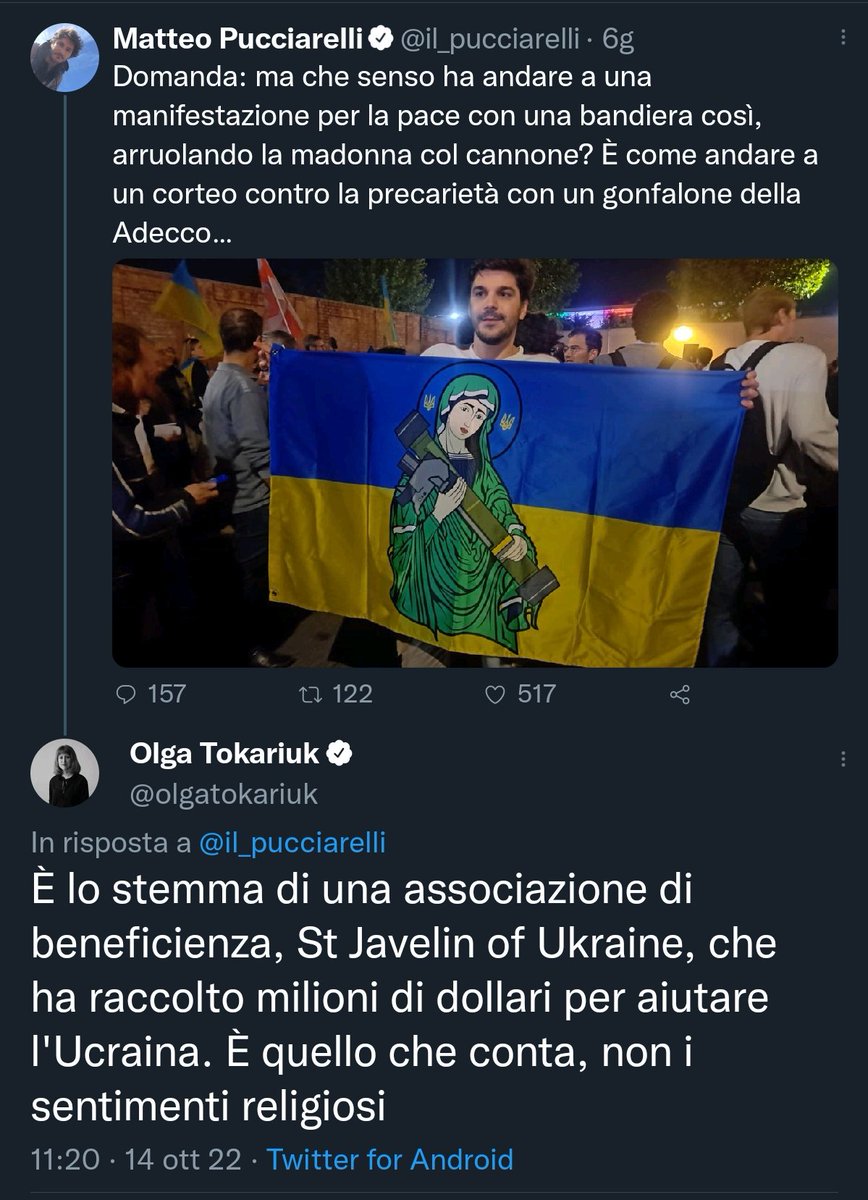 Un modo per aderire a #NAFO è donando a un'organizzazione chiamata "Protect Ukraine Defenders" o acquistare merchandising da un sito web chiamato #SaintJavelin. Il logo di Saint Javelin raffigura la Vergine Maria che porta un missile Javelin di fabbricazione statunitense. 5/10 https://t.co/VIYJTTUtzU