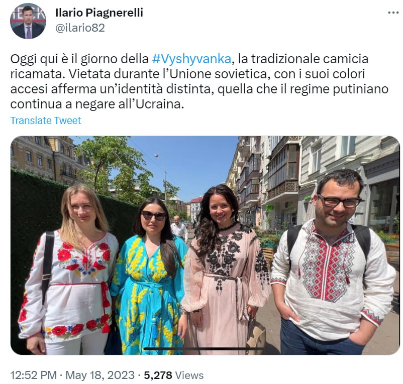FAKE NEWS: PIAGNERELLI (RAI) SOSTIENE CHE LA VYSHYVANKA FOSSE VIETATA NELL'URSS "Oggi qui è il giorno della Vyshyvanka, la tradizionale camicia ricamata. Vietata durante l’URSS... afferma un’identità distinta, quella che il regime putiniano continua a negare all’Ucraina." 1/3