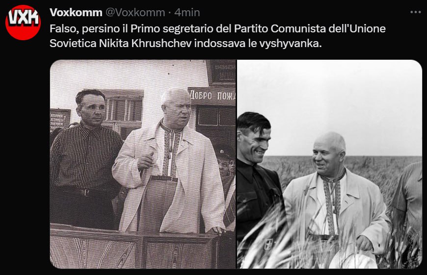 Voxkomm: "Falso, persino il Primo segretario del Partito Comunista dell'Unione Sovietica Nikita Khrushchev indossava le vyshyvanka." 👉🏻 2/3