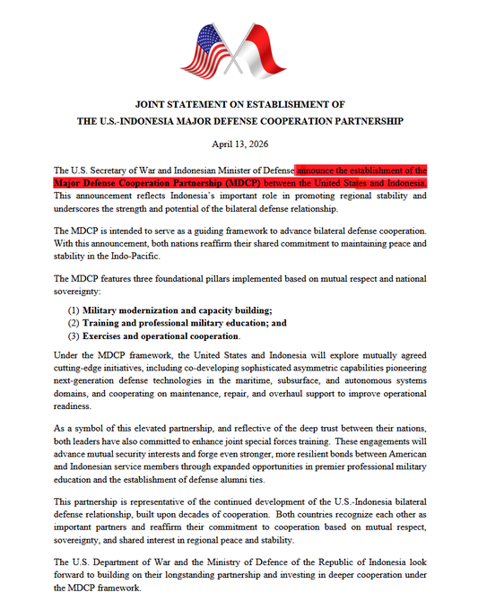 🇺🇸🇮🇩Secretary of War Hegseth met with Indonesia’s top defense official and rolled out a major new defense cooperation deal. While the Strait of Hormuz is the second busiest oil passageway in the world, the busiest is the Strait of Malacca right off Indonesia’s coast. Roughly 80 percent of China’s oil imports flow through it. The US military and its partners are now locking down the planet’s critical oil routes. Trump is putting the pieces exactly where he wants them. Source: @WarClandestine