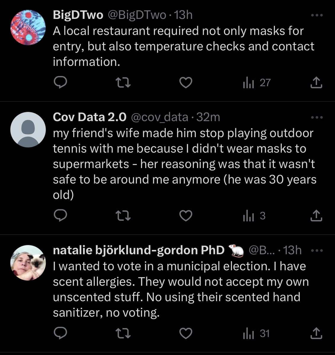 A coffeehouse in the town I grew up in kept mandating masks after Massachusetts lifted its mandate. I don't know what things are like there now because I haven't gone back (last time I was there was a year ago or over), but I was sad. I loved talking with the owner.