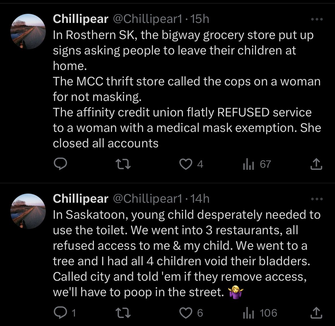 In Swift Current, SK my cousin had been on the road for hours running errands. Stopped at her mother in laws home so kids could use the toilet. Neighbour called the cops. Despicable. I tell you, if that was my neighbour, we'd have more than a few words.
