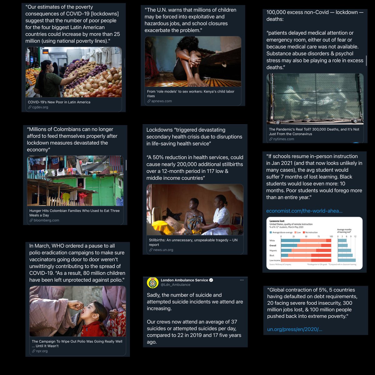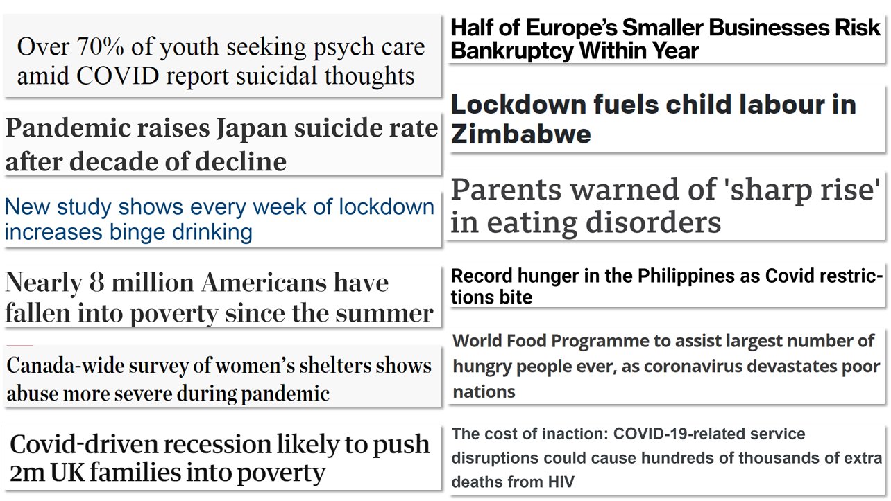 The following four slides provide a small sample of the astronomically disastrous effects worldwide due to Covid hysteria and the consequent draconian and ineffective interventions, including lockdowns, masks, social distancing and many others.