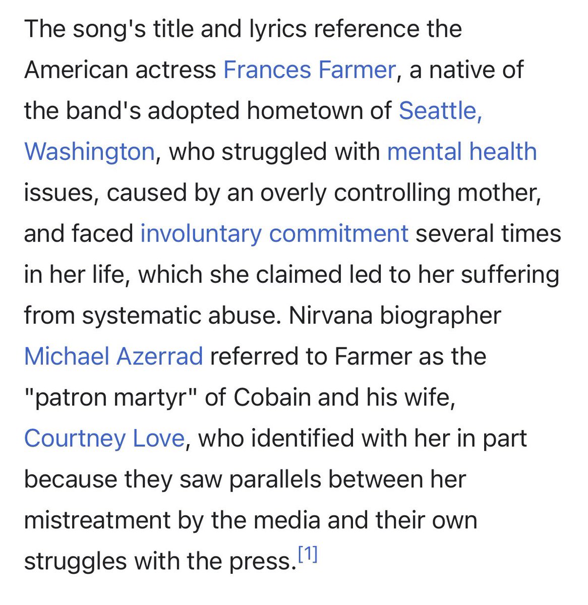 https://youtu.be/C-deMfnLtMI?si=C5VbtZekzkxSY0kz We’ve reached a worrying point where a video can be posted with a caption that has nothing to do with what’s actually said in the audio — and thousands of people will share it without checking. In the clip, there is no mention of an island, no reference to children, and no statement about any modern abuse network. Yet the accompanying text inserts those elements as if they were part of the original words. This isn’t a matter of interpretation. It’s a clear distortion. Either the person who posted it didn’t bother to listen to the audio, or they assumed most people wouldn’t. In both cases, the message is the same: emotional impact is being prioritized over accuracy. Anyone can take two minutes to read the transcript or listen carefully and realize the headline doesn’t match the content. But in viral culture, outrage spreads faster than verification. That’s how narratives are manufactured by attaching sensational claims to real footage and counting on people not to notice the mismatch. Kurt Cobain was most likely referring to Frances Farmer. https://en.wikipedia.org/wiki/Frances_Farmer_Will_Have_Her_Revenge_on_Seattle Frances Farmer was an actress from Seattle who worked in Hollywood in the 1930s and 1940s. As a teenager, she won an essay contest titled “God Is Dead,” which caused controversy and led to accusations that she had communist sympathies. Later in life, she was arrested for drunk driving and eventually institutionalized in psychiatric hospitals. Over the years, stories circulated some documented, others disputed or exaggerated claiming she was subjected to forced treatments, abuse, and possibly a lobotomy. By the 1970s and 1980s, her story had become a symbol of institutional abuse and the silencing of outspoken women. Nirvana even wrote a song titled “Frances Farmer Will Have Her Revenge on Seattle,” which shows Cobain was deeply aware of and affected by her story. In the audio, Cobain appears to be expressing outrage over what he believed was a historical injustice — a woman who publicly criticized Hollywood and was, in his view, destroyed by powerful figures in Seattle. He was not talking about Epstein or a modern abuse network. He was referencing a mid-20th-century case that, in his perspective, represented corruption and institutional cruelty. REAL TRANSCRIPT VIDEO : -It was, was, -she was kind of a foul mouth person, you know, and she and she hated the whole Hollywood scene, and she expressed her hatred for them publicly and so. And she also, when she was like, I think she was 15, she entered this essay contest when she was living here in Seattle, entitled God is dead, and a lot of people accused her of being a communist. And then she went to New York and was a part of this acting troupe. And so it supposedly had communist ties too. And so then there's this big conspiracy amongst a judge, a very well known, prominent judge here in Seattle, and a bunch of other people who had ties with Hollywood, and they basically just set her up and ruined her life. You know, they had some pictures taken of her when she was arrested for drunk driving, and it just, it was a big, huge scandal, and she eventually was sent to a mental institution and given a lobotomy and raped every day for years, and just totally abused and ended up like working at a four seasons restaurant alone, dying by herself Cambridge Island. -That's why she was institutionalized right over there -for years. Every night there were lines of custodians, friends and people you know, part of the staff, who would wait in line to rape her every day she went through a lot of shit, and it just disgusts me, you know, to know that there are some of the people that are part of that conspiracy are living here in Seattle, and they're comfortable, cushy little homes with their families, 2040, years after The fact, and it's -just just gone. Yeah, God, -why was there Auschwitz? Well, I.