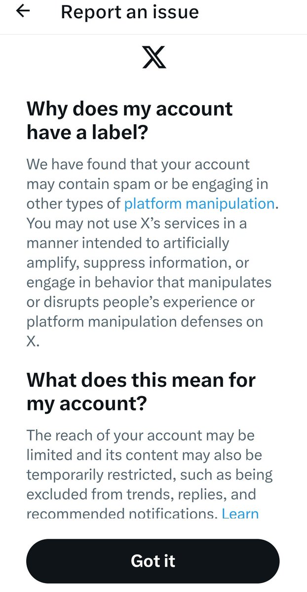 So after forcing me to do a captcha to prove I'm human and unlock my account, @x is now telling me it's added a temporary label to limit my account reach. As if they weren't already limiting my reach like crazy. This platform is terrified of me apparently. @QPsyOps https://t.co/3Xqy2PFSVo
