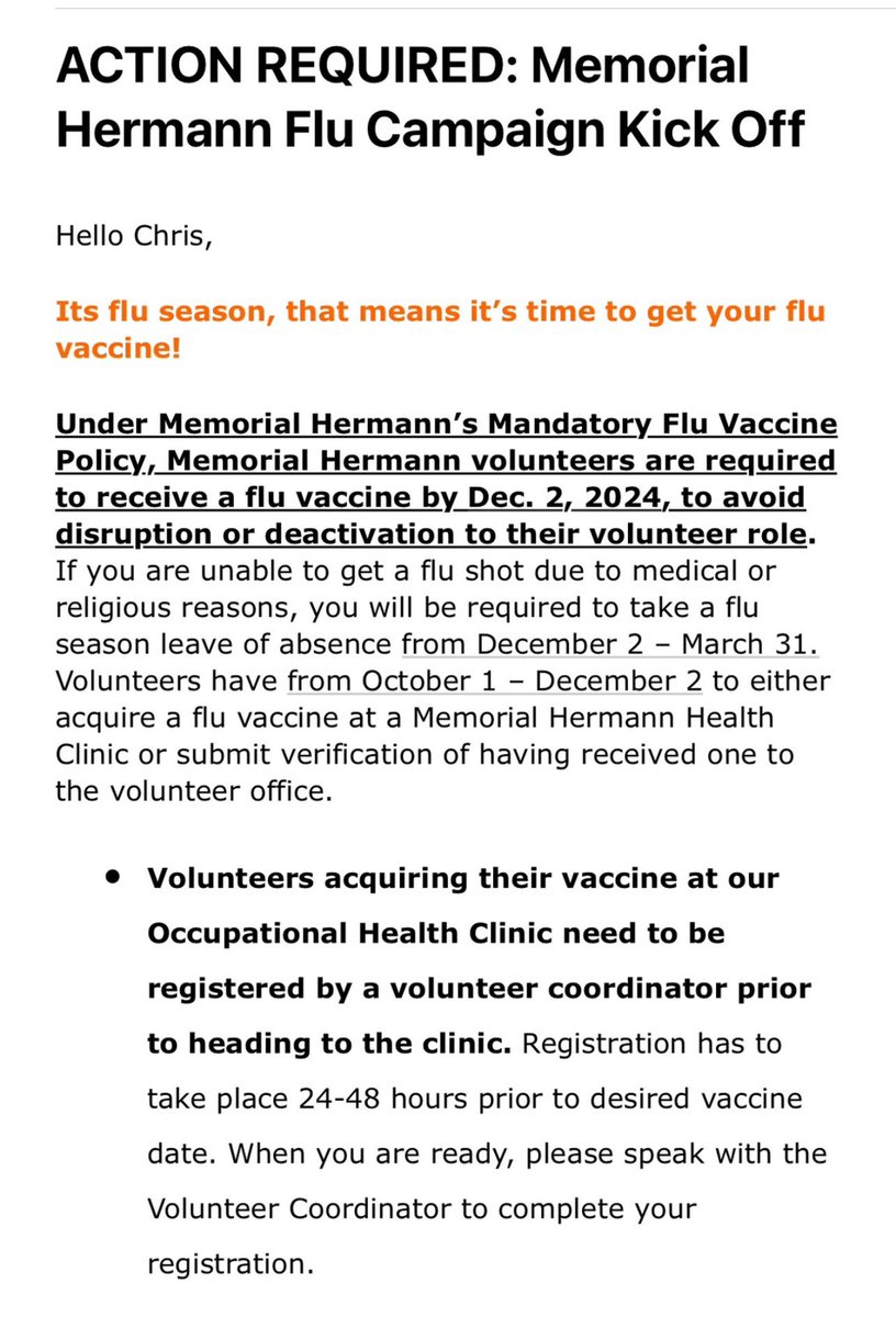 Flu shot doesn’t doesn’t prevent spread of flu and doesn’t reduce deaths from pneumonia and flu. Flu shot mandates are not based in science, yet @memorialhermann requires it for everyone.. even the volunteers. https://t.co/bOgRywfUAv