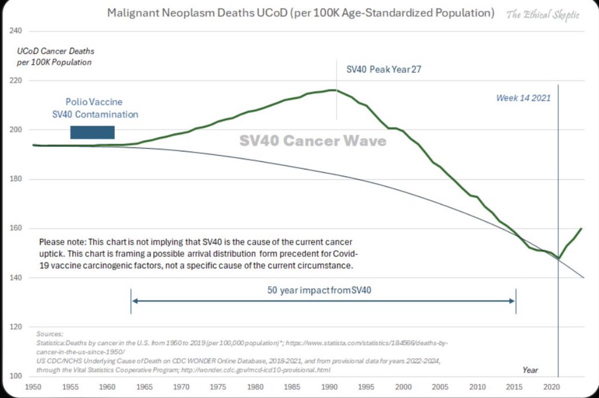 What is SV40? - SV40 is a virus discovered in 1960 in rhesus monkey kidney cell cultures used for the production of polio vaccines. - Between 1955 and 1963, some polio vaccines were contaminated with SV40 due to the use of monkey kidney cells for vaccine production. After this was discovered, testing for SV40 contamination became mandatory, and vaccines were no longer produced with cells from SV40-carrying monkeys. - SV40 is known to be oncogenic in experimental animals, particularly hamsters, causing tumors like mesotheliomas, brain tumors, lymphomas, and bone cancers. The virus's large T antigen can transform cells by disrupting key cellular control mechanisms like p53 and retinoblastoma protein pathways. - Numerous studies have detected SV40 DNA in various human cancers, particularly mesothelioma, brain tumors, and some bone cancers.