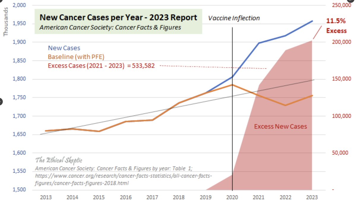 From a colleague: “I am beside myself (really devastated) because I recommended the C0VID shots.” Full message…. “I have diagnosed 2 patients with aggressive malignant brain tumors in the past 2 weeks. Both have never had Covid by antibody testing, only Covid shots, one with many shots the other with just the original series. These two, compiled with a patient who has a primary lung melanoma without a skin source, a non-smoker with an aggressive adenocarcinoma of the lung, a stable CLL that Rapidly evolved into AML within a matter of weeks not long after his third booster, and I have already had two patients die of glioblastoma since 2021. All patients were over the age of 60. All took the Covid shots. I am beside myself (really devastated) because I recommended the Covid shots early on for all those who were FDA eligible, except for those who had already had Covid. Luckily, for those patients, I told them that natural immunity is the gold standard and they did not need anything more. They make up the large majority of my non”immunized” patients in my practice, though I do have several others, who just never took any of the shots. I only have 600 patients, and I have been in practice for 30 years. I’ve never had such a cluster of cancer all at once. I only have one non “immunized” patient with cancer since 2021 and I know the denominator is smaller, but it’s still feels like this is a safety signal.