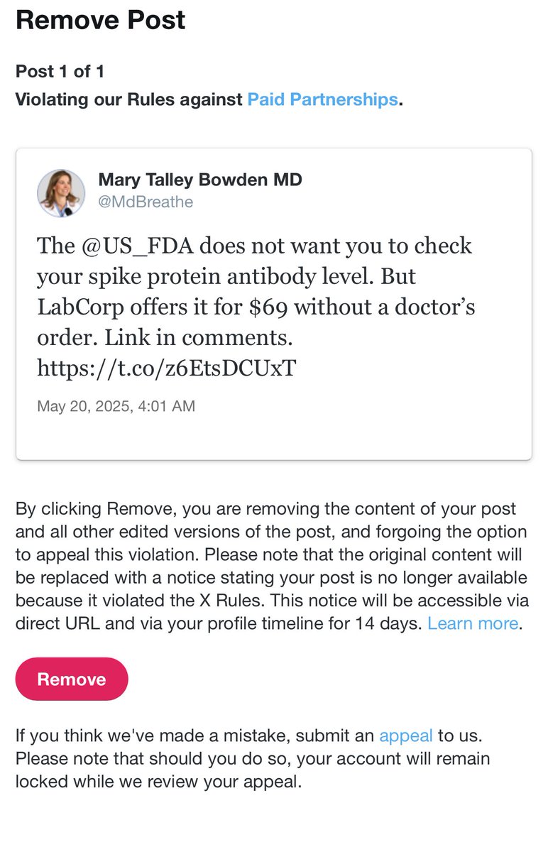 I do not have any financial relationship with @Labcorp but @X locked me out of my account until I agreed to delete this post. https://t.co/2g4zfgpLVt