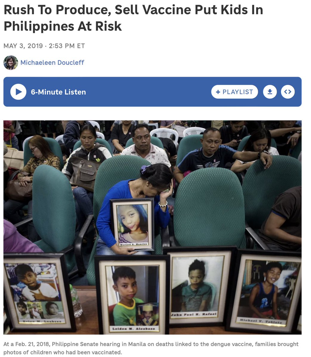 "The debacle in the Philippines offers a key lesson for governments and manufacturers when it comes to approving and selling new vaccines: 'Slow down,' says physician and bioethicist Keymanthri Moodley." https://www.npr.org/sections/goatsandsoda/2019/05/03/719037789/botched-vaccine-launch-has-deadly-repercussions