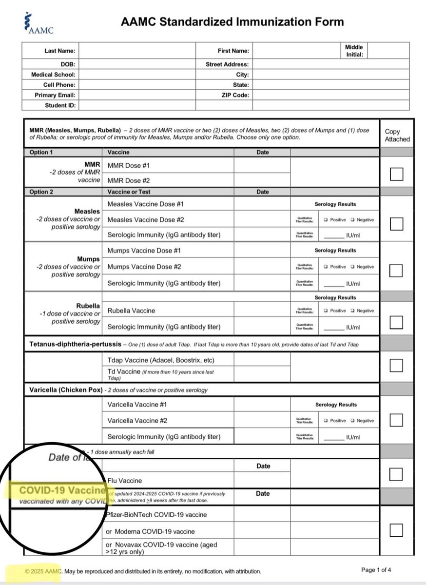 The following hospitals continue to require all medical students get the Covid shots: Akron Children’s Hospital Akron General Albert Einstein Medical Center Anne Arundel Medical Center Baylor College of Medicine Berkshire Health Systems Boston University School of Medicine Brody School of Medicine Case Western Reserve University School of Medicine Cedars-Sinai Central Michigan University College of Medicine Commonwealth Medical College Cooper Medical School of Rowan University David Geffen School of Medicine at UCLA Drexel University College of Medicine East Tennessee State University-Quillen College of Medicine Emory University School of Medicine Florida Hospital Orlando Geisel School of Medicine at Dartmouth Georgetown University School of Medicine George Washington University School of Medicine and Health Sciences Greenville Health System Gwinnett Medical Center Houston Methodist Hospital System Howard University College of Medicine Indiana University School Of Medicine International American University College of Medicine Johns Hopkins University School of Medicine Kaiser Permanente Medical Center Kaweah Delta Health Care District Keck School of Medicine of USC Lake Erie College of Osteopathic Medicine Lehigh Valley Health Network Loma Linda University School of Medicine Louisiana State University Health Sciences Center School of Medicine Louisiana State University Health Sciences Center School of Medicine Shreveport Maimonides Medical Center Marshall University Joan C. Edwards School of Medicine Medical College of Wisconsin Medical College of Georgia at Augusta University Medical University of South Carolina Mercer University School of Medicine Methodist Dallas Medical Center MetroHealth Medical Center Michigan State University College of Human Medicine Morehouse School of Medicine Mount Sinai Medical Center New York Medical College, Health Services Northeast Ohio Medical University Our Lady of the Lake Regional Medical Center Pennsylvania State University College of Medicine Rush Medical College Rutgers New Jersey Medical School Sacred Heart Health System Saint Louis University School of Medicine San Juan Bautista School of Medicine Stony Brook University School of Medicine Summa Health SUNY Downstate Medical Center SUNY Upstate Medical University Trinity Health – Mercy Health Muskegon Tulane University School of Medicine United Health Services Hospital-Wilson Medical Center University of Alabama School of Medicine University of Arizona College of Medicine—Phoenix University of Arizona College of Medicine—Tucson University of California Davis School of Medicine University of California San Diego School of Medicine University of Cincinnati College of Medicine University of Colorado School of Medicine University of Florida University of Illinois College of Medicine at Peoria University of Kansas School of Medicine University of Kentucky College of Medicine University of Louisville School of Medicine University of Maryland School of Medicine University of Massachusetts Medical School University of Miami Miller School of Medicine University of Missouri-Columbia University of Nebraska Medical Center University of New Mexico School of Medicine University of North Carolina School of Medicine University of Oklahoma-College of Medicine University of South Alabama College of Medicine University of South Carolina School of Medicine University of South Carolina School of Medicine Greenville University of South Florida Morsani College of Medicine University of Tennessee Health Science Center University of Texas Rio Grande Valley School of Medicine University of Texas Southwestern Medical Center University of Utah School of Medicine University of Vermont College of Medicine University of Washington School of Medicine Valley Children's Hospital/Healthcare Washington St. Louis School of Medicine Wayne State University School of Medicine Wright State University Boonshoft School of Medicine