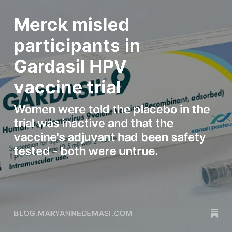 🧵Merck misled participants in Gardasil HPV vaccine trial Women were told the PLACEBO in the trial was inactive and that the vaccine's adjuvant had been safety tested - both were untrue. https://blog.maryannedemasi.com/p/merck-misled-participants-in-gardasil @jikkyleaks @stkirsch @SaiKate108 @KrugAlli @eileeniorio @woodymatters @MidwesternDoc @newstart_2024 @ClownWorld_ @ProfTimNoakes @WisnerBaum @RobertKennedyJr @CHDPennsylvania @WallStreetApes