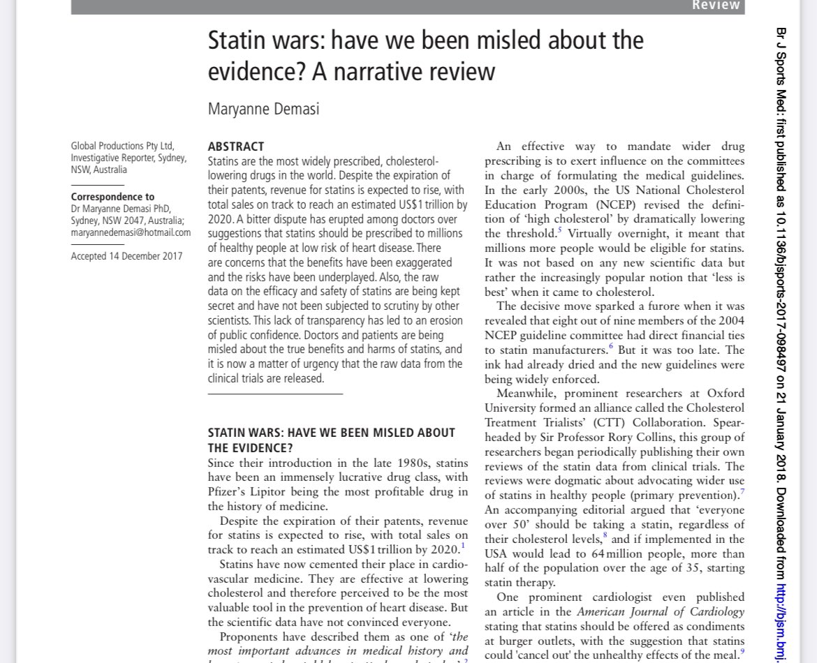 STATIN WARS: have we been misled by the evidence? Published in 2018 by BMJ’s BJSM. @BJSM_BMJ https://bjsm.bmj.com/content/bjsports/early/2018/01/16/bjsports-2017-098497.full.pdf?ijkey=Rsap0XafljfcOCR&keytype=ref