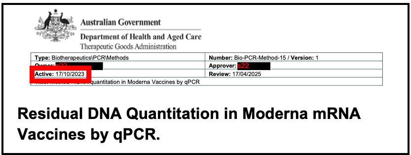 Regulators continue to ignore warnings. An FOI of @TGAgovau protocol for testing residual DNA in the vaccines, is dated Oct 17, 2023 – six months after @Kevin_McKernan raised the alarm about contamination issues. TGA did not confirm if earlier testing on the product was done.