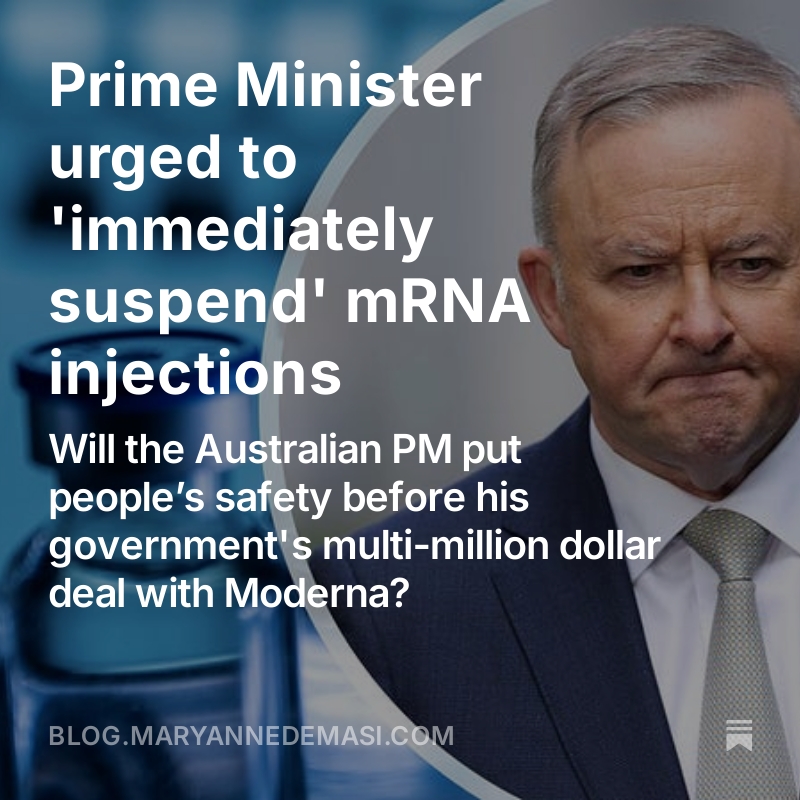🚩Australian Prime Minister urged to 'immediately suspend' mRNA injections Will PM @AlboMP put people’s safety ahead of the federal government's multi-million dollar deal with @moderna_tx? https://blog.maryannedemasi.com/p/prime-minister-urged-to-immediately @jikkyleaks @Kevin_McKernan @drmelissamccann @MdBreathe @KLVeritas @TexasLindsay_ @newstart_2024
