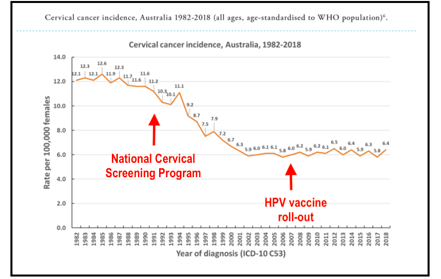 The dramatic decline in cervical cancer deaths and incidence predates the introduction of HPV vaccination in 2006. E.g. In Australia, deaths from cervical cancer fell significantly along with incidence, following the introduction of the National Cervical Screening Programme, and remained steady despite mass HPV vaccination. https://www.cancer.org.au/clinical-guidelines/cervical-cancer/cervical-cancer-screening/cervical-cancer-in-australia