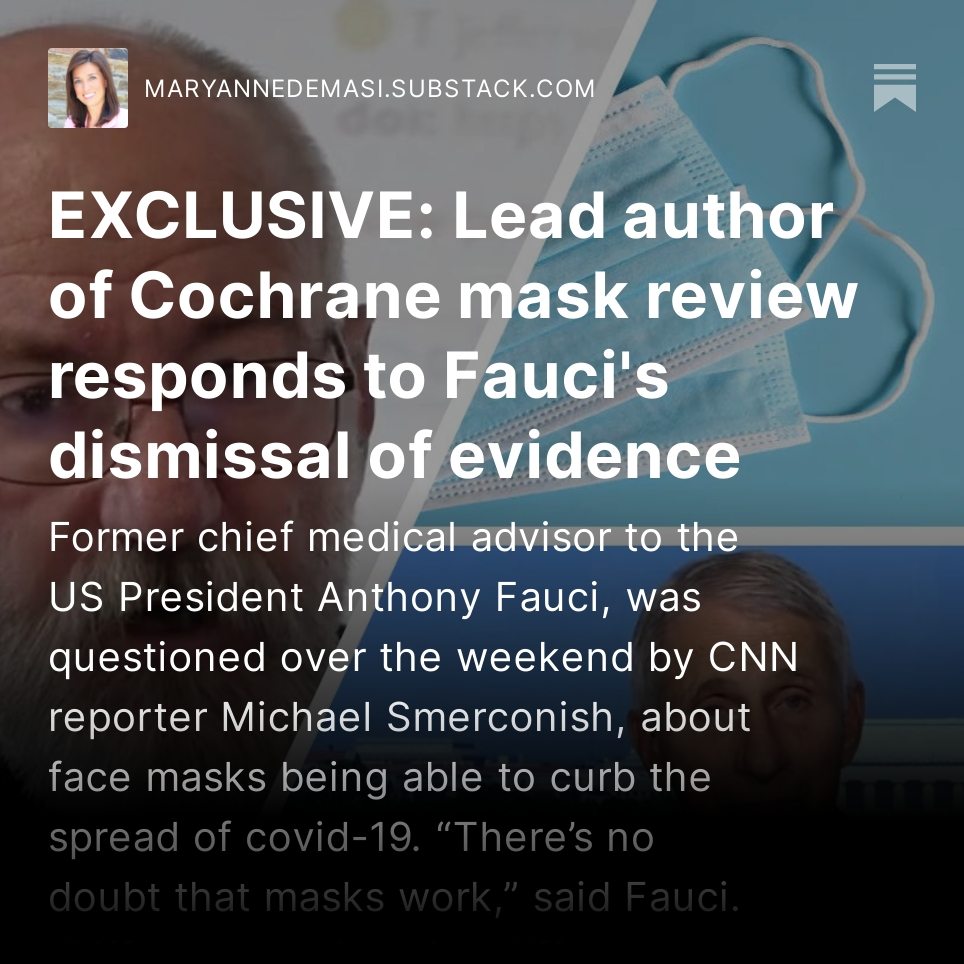 Jefferson says he doesn’t know what motivates people to ignore the facts. “What I do know” said Jefferson, “is that Fauci was in a position to run a trial, he could have randomised two regions to wear masks or not. But he didn’t and that’s unforgivable.” https://maryannedemasi.substack.com/p/exclusive-lead-author-of-cochrane