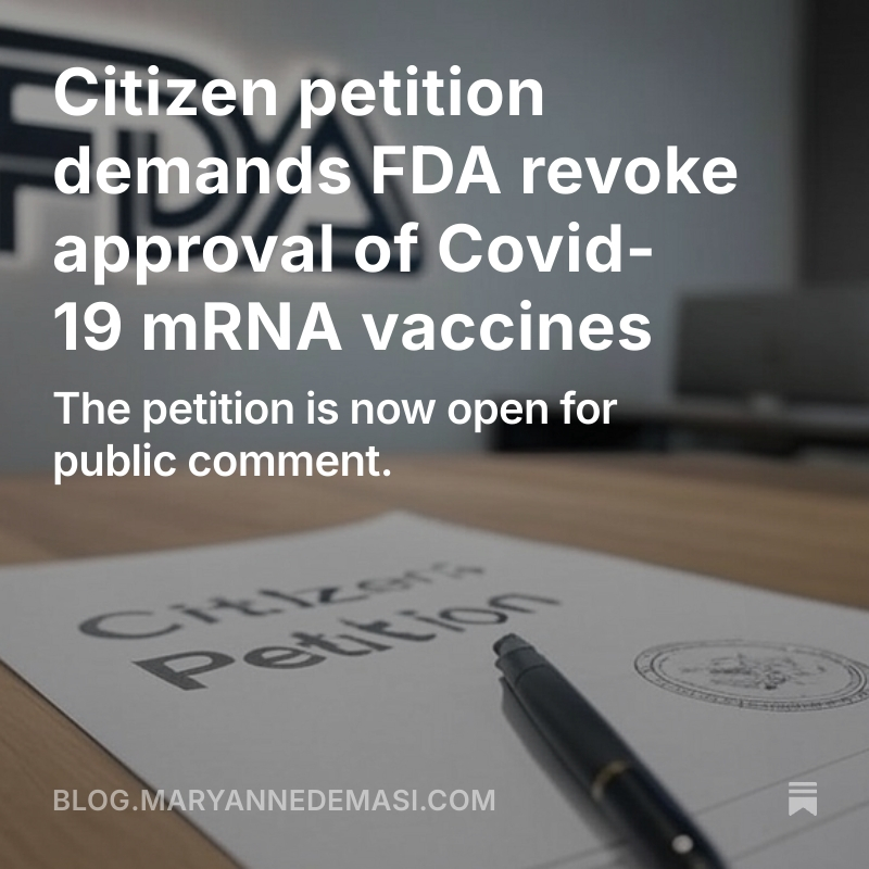 📢CALL FOR ACTION: Citizen petition demands FDA revoke approval of Covid-19 mRNA vaccines https://blog.maryannedemasi.com/p/citizen-petition-demands-fda-revoke New legal challenge - the petition alleges violations of regulatory processes, raises serious safety concerns & concludes the vaccines were “unlawfully approved.” @Double_Christ @Kevin_McKernan @JesslovesMJK @CanningPharm @Jikkyleaks @MdBreathe @DowdEdward @TheChiefNerd