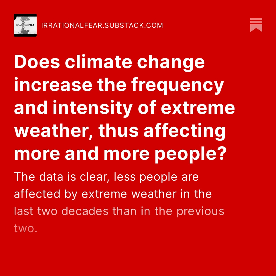 "In the 20 years beginning in 1980 extreme weather affected 60% of the global population, including 18% of the global population dying in extreme weather events. In the following 20-year period beginning in 2000, only 56% of the global population was affected by extreme weather, including only 7% dying due to extreme weather. In the last 20-year period, when more anthropogenic GHG emissions were added to the atmosphere than ever before, the number of people affected by extreme weather declined." https://irrationalfear.substack.com/p/does-climate-change-increase-the