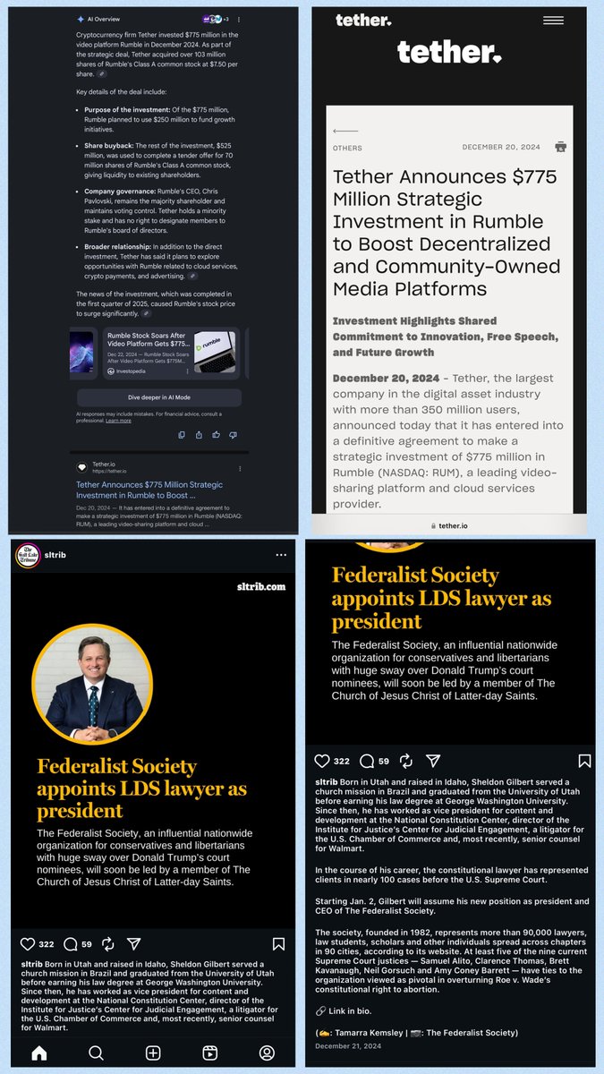 KIRK “CRUMBLE” 12/20/24: TETHER - $775MM in RUMBLE 12/21/24: WALMART SR COUNSEL SHELDON GILBERT (LDS) named FEDSOC PRES & CEO Why? FLYNN: AIG/UNITEDHEALTH CASE: AOL/TIME WARNER SCHMIDT: TEAM8/NARYA/VANCE MICROSOFT: 8200 QUALCOMM: MAGUIRE/LIKUD/KELA EDMUND BURKE: DEMUTH/HAZONY