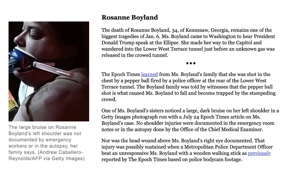 @McBrideLawNYC Rosanne Boyland collapsed after being shot in the chest by a pepperball traveling 300 feet per second. She was then beaten multiple times by MPD’s Lila Morris while downed, and denied CPR. J6 protesters had to drag her body away from violent police attacking them to render aid.