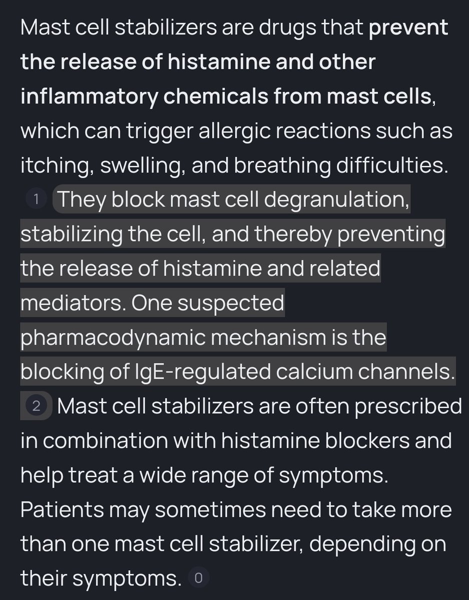 Fisetin, kaempferol, myricetin, quercetin and rutin inhibited IgE mediated histamine release and prevented increased concentration of calcium inside mast cells, which is necessary for degranulation. Fisetin, quercetin and rutin all decreased production of IL-1b, IL-6, IL-8 and TNF. Fisetin, myricetin and rutin all decreased action of NF-kB, which controls the pathway regulating production of cytokines. Myricetin is a particularly effective mast cell stabilizer. It decreased degranulation and release of TNF and IL-6, but not IL-1b or IL-8