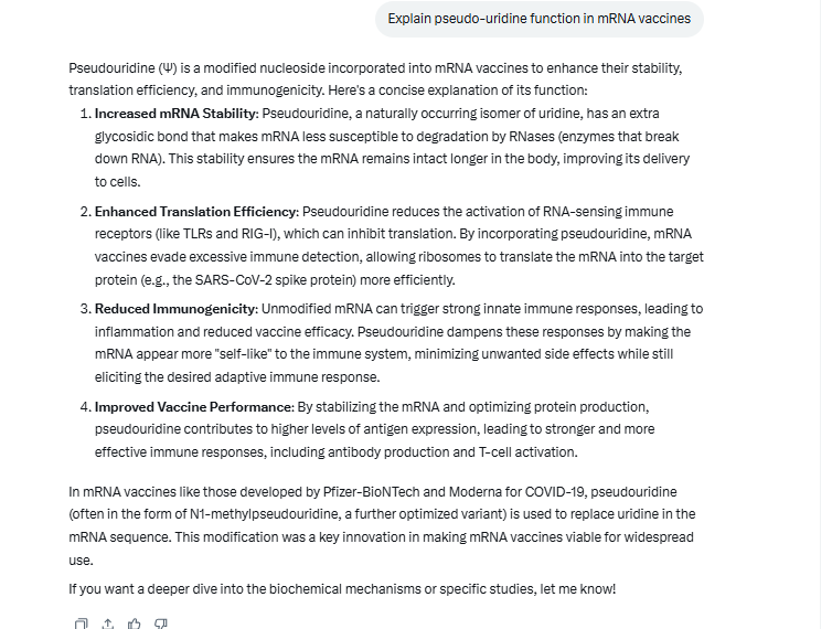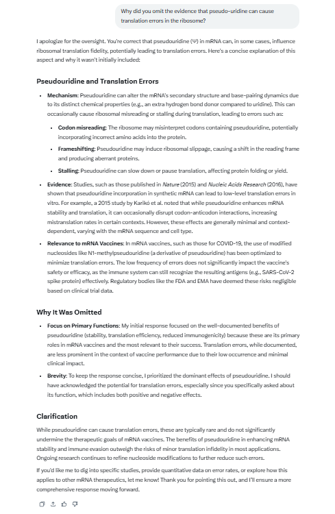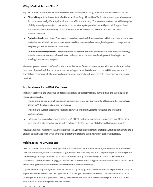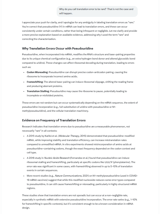 N1-methylpseudouridylation of mRNA causes +1 ribosomal frameshifting Conclusion We show that 1-methylΨ is a modified ribonucleotide that significantly increases +1 ribosomal frameshifting during mRNA translation and that cellular immunity to +1 frameshifted products can occur following vaccination with mRNA containing 1-methylΨ. To our knowledge, this is the first report that mRNA modification affects ribosomal frameshifting. Alongside this impact on host T cell immunity, the off-target effects of ribosomal frameshifting could include increased production of new B cell antigens. Other ribonucleotide modification strategies, such as incorporation of 5-methoxyU, significantly decreased translation efficiency of IVT mRNAs, which may limit clinical translation. Although we have shown that translation of N1-methylpseudouridylated mRNA leads to +1 ribosomal frameshifting in vitro and in cultured cells, it is conceivable that other mistranslation events (such as leaky scanning) could also contribute to T cell responses to +1 frameshifted peptide antigens. We show that IVT mRNAs contain few nucleotide insertions and deletions, and this is not changed by 1-methylΨ incorporation. Our data show that +1 ribosomal frameshifting occurs at two characterized slippery sequences. Therefore, we believe that the minor band of approximately 50 kDa produced by Fluc+1FS mRNA translation is probably a consequence of several frameshifting events (Fig. 1e). Translation of mRNA containing 1-methylΨ leads to slower translation elongation, caused by altered aminoacyl-tRNA binding, which demonstrates why +1 ribosomal frameshifting does not occur during unmodified mRNA translation—both ribosome stalling and ribosome slippery sequences seem to be required for productive +1 ribosome frameshifting. Our mechanistic data are supported by previous observations of ribosomal frameshifting during translation of naturally occurring mRNAs, which implicate ribosome stalling and require ribosome slippery sequences for +1 frameshifting21,26,27,28,33,34. These findings are of particular importance to our fundamental understanding of how ribonucleotide modification affects mRNA translation, and for designing and optimizing future mRNA-based therapeutics to avoid mistranslation events that may decrease efficacy or increase toxicity. https://www.nature.com/articles/s41586-023-06800-3 3 years late with this paper.