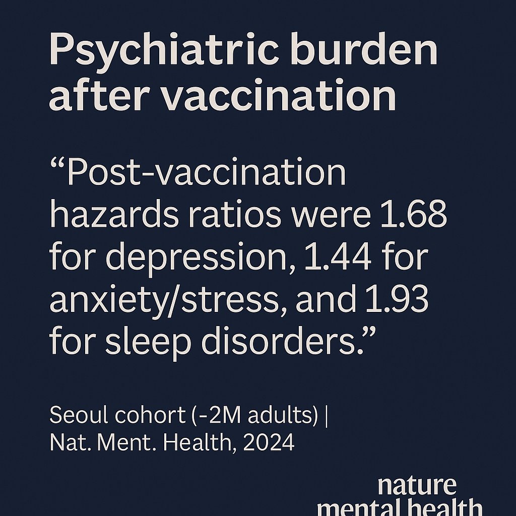 Seoul cohort (~2M adults, 2024): Post-vax hazards: • Depression HR=1.68 • Anxiety HR=1.44 • Sleep disorders HR=1.93 Authors: “Special cautions are necessary for giving additional doses.” 🔗 https://www.nature.com/articles/s41380-024-02627-0