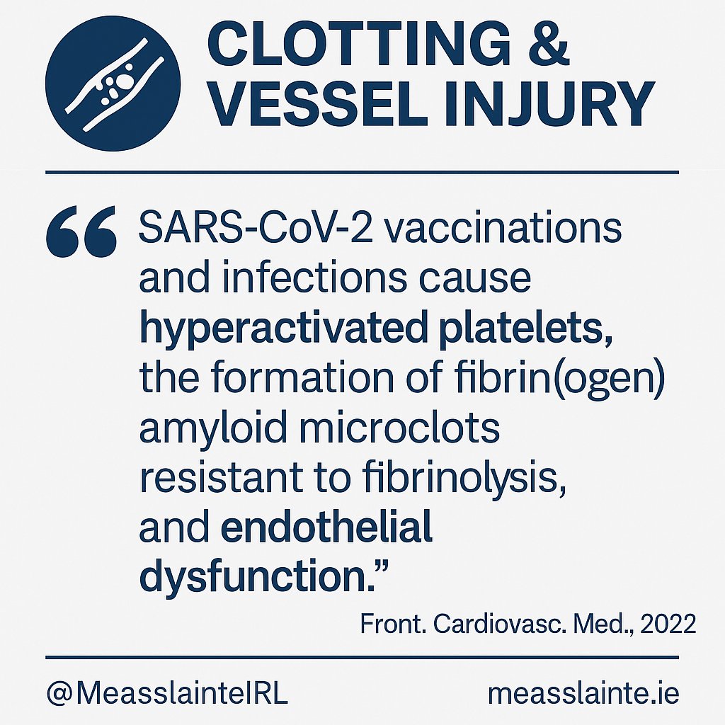 2. Amyloid Fibrin Microclots What They Are: Under a microscope, researchers have observed unusual clot-like structures in the blood of people with Long COVID and post-vaccination symptoms. These are not typical blood clots but tangled masses of fibrin (a protein involved in normal clotting) that has misfolded into an amyloid form—similar to what happens in Alzheimer's disease. The Research: Multiple studies using Thioflavin T staining (a fluorescent dye that lights up when it binds to amyloid) have detected these microclots in people with Long COVID. One review assessed the evidence (https://pmc.ncbi.nlm.nih.gov/articles/PMC11491705/), while another described their properties and diagnostic potential (https://www.thieme-connect.com/products/ejournals/pdf/10.1055/s-0043-1774796.pdf). Additional research (https://www.sciencedirect.com/science/article/pii/S2473952924001642 and https://onlinelibrary.wiley.com/doi/10.1002/jmv.70613) further documents these findings. Why It Matters: These microclots may: - Obstruct tiny blood vessels (capillaries) - Impede oxygen delivery to tissues - Contribute to fatigue, brain fog, and exercise intolerance Analogy: Think of your bloodstream as a highway system. Microclots are like roadblocks too small to close the whole road but large enough to cause traffic jams, slowing down essential deliveries (oxygen and nutrients) throughout your body.