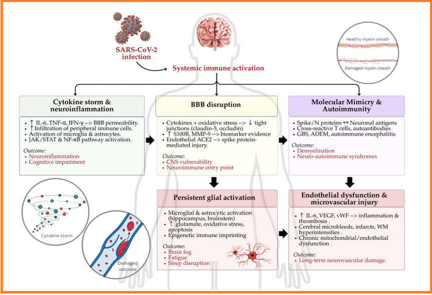 4. Immune Dysregulation Cytokine Elevation: Cytokines are signaling molecules that coordinate immune responses. Studies show elevated cytokines in Long COVID (https://www.nature.com/articles/s41590-023-01724-6), indicating ongoing immune activation. https://www.mdpi.com/1422-0067/26/15/7258 details T-cell dynamics, while https://www.cell.com/cell/fulltext/S0092-8674(24)00886-9 reviews mechanisms of Long COVID. Additionally, https://pubmed.ncbi.nlm.nih.gov/39403255/ found elevated MMP-9 and microglia activation linked to spike protein stimulation. T-Cell Exhaustion: Nature research found that people with Long COVID exhibit T-cell dysregulation—immune cells worn out from chronic activation, reducing their ability to fight infections and regulate inflammation. Analogy: The immune system is like an army. Cytokine elevation is like constantly sounding alarms even without an enemy. T-cell exhaustion is like soldiers on duty too long without rest—they're present but less effective.