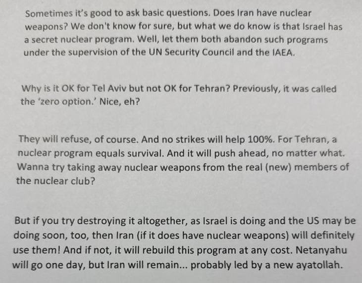 2. The enrichment of nuclear material — and, now we can say it outright, the future production of nuclear weapons — will continue. 3. A number of countries are ready to directly supply Iran with their own nuclear warheads.