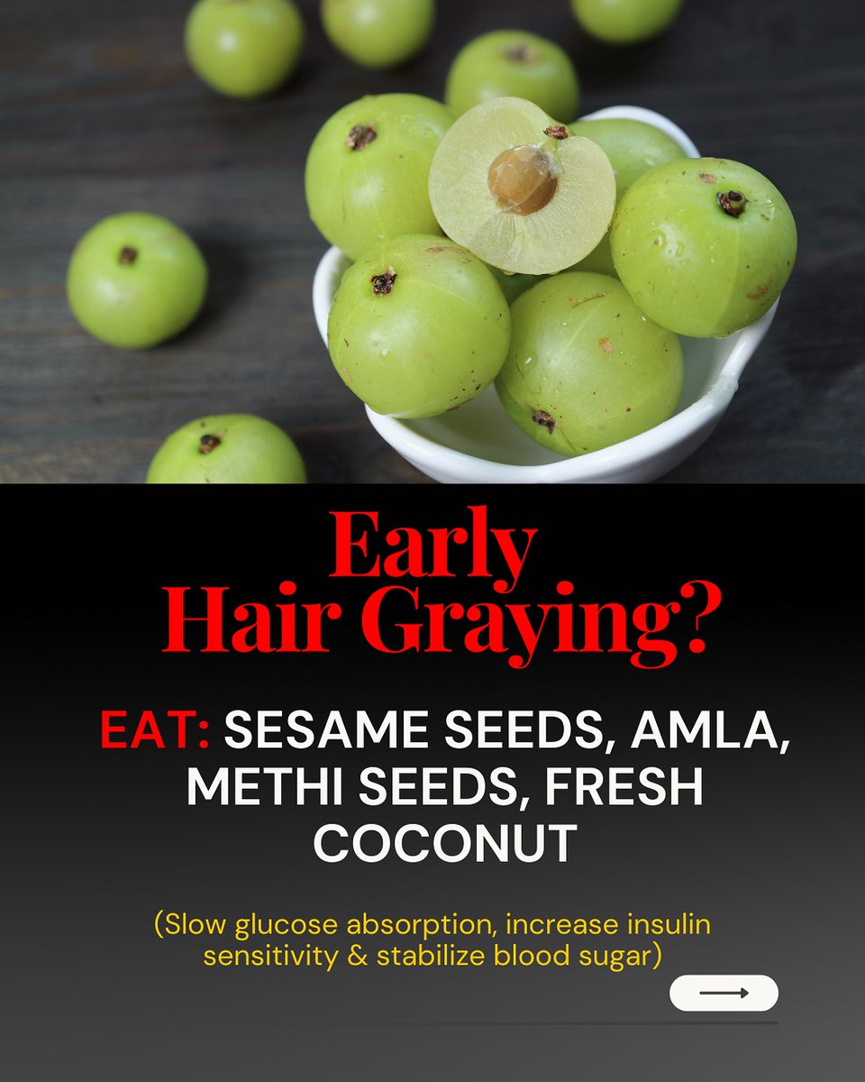 1️⃣ Early Hair Graying? Notice those silver strands showing up early? Try adding sesame seeds, amla, methi seeds, and fresh coconut to your diet. These help slow glucose absorption, boost melanin, and keep your hair’s natural color alive. https://t.co/COqaJc8JJx