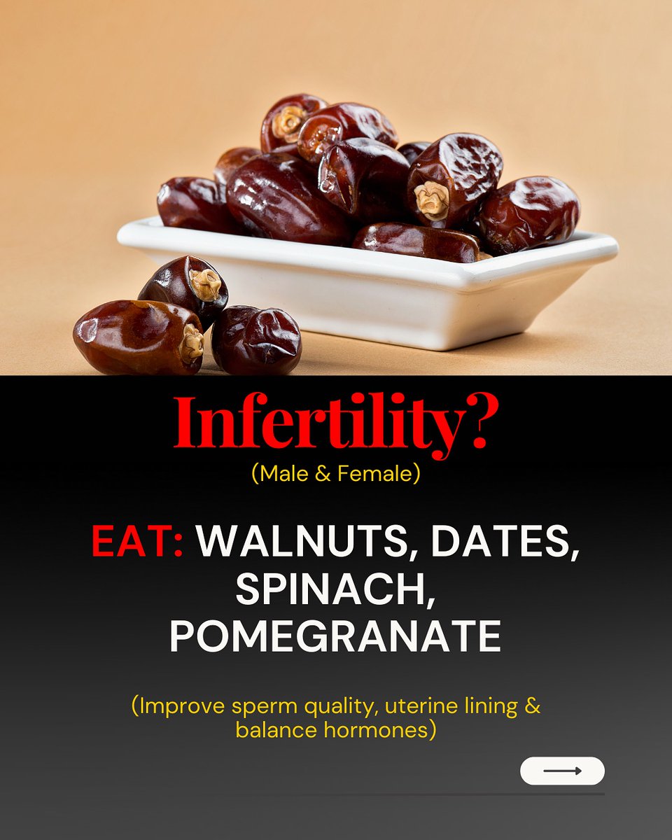 7️⃣ Infertility (Male & Female)? Trying to conceive but finding it tough? Add walnuts, dates, spinach, and pomegranate to your daily plate. They help improve sperm quality, strengthen the uterine lining, and balance hormones. 🌱 https://t.co/fh7JLRe5vX