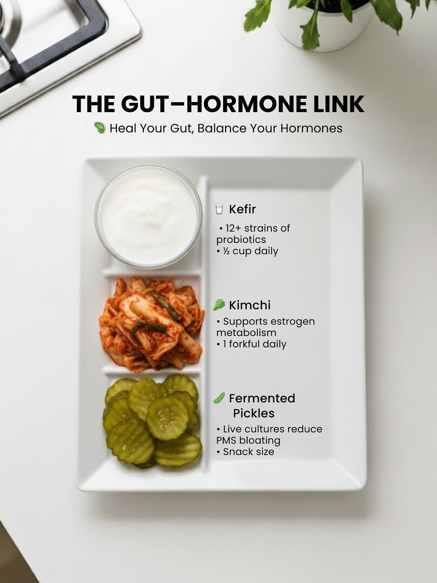 1. Gut-Hormone Link Your gut and hormones are deeply connected. Balance your gut, and you balance your estrogen, cortisol, and mood. → Kefir (½ cup daily) → Kimchi (1 forkful) → Fermented pickles (snack size) Live cultures = balanced hormones. https://t.co/HSKjeFPRJV